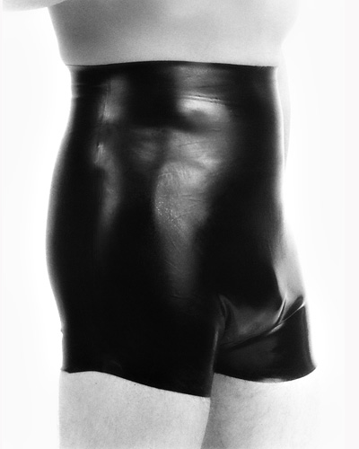 Diese Shorts aus getauchtem Latex besitzen eine hochgeschnittene Taille, und ein eingearbeitetes Analpräservativ. Die Materialstärke beträgt ca. 0,4mm.